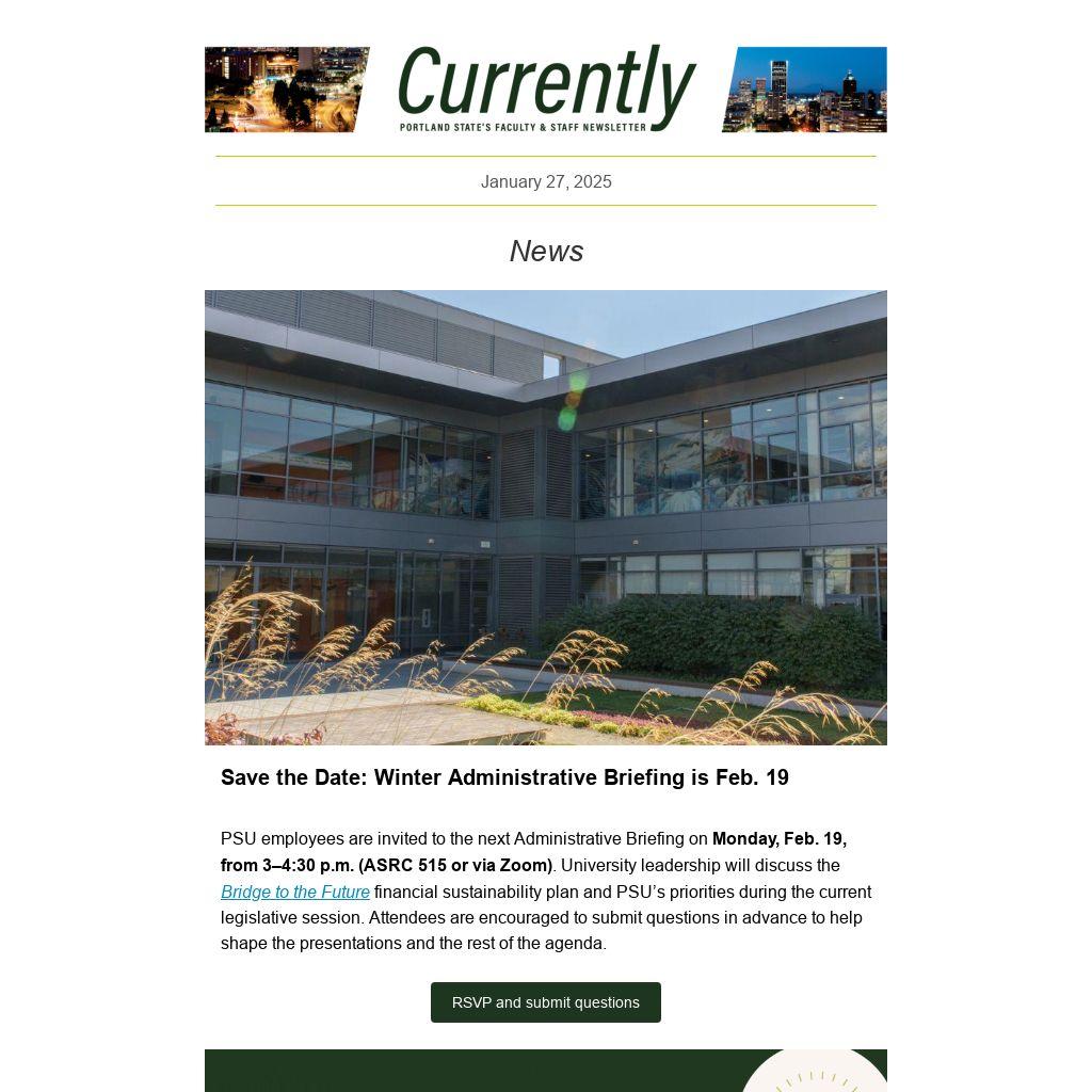 PSU employees are invited to the next Administrative Briefing on Monday, Feb. 19, from 3–4:30 p.m. (ASRC 515 or via Zoom). University leadership will discuss the Bridge to the Future financial sustainability plan and PSU’s priorities during the current legislative session. Attendees are encouraged to submit questions in advance to help shape the presentations and the rest of the agenda.