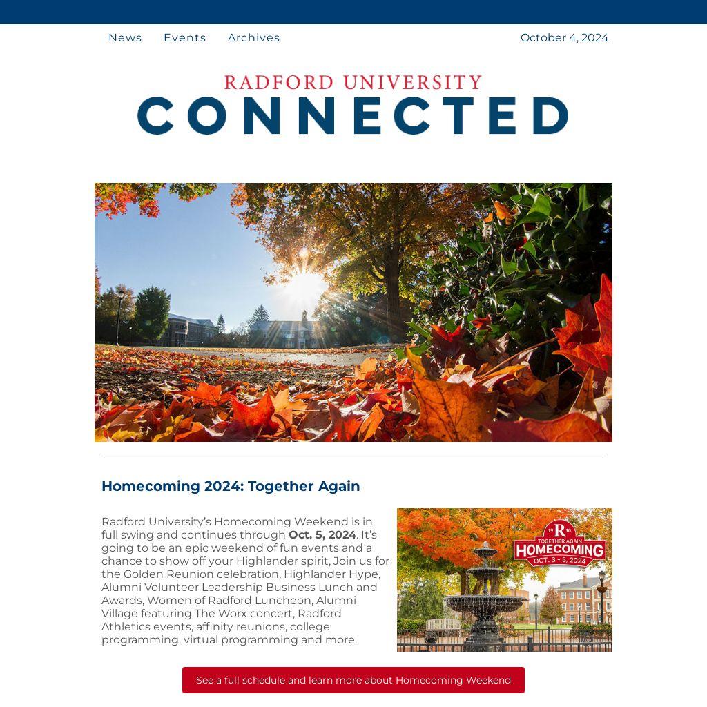 Just a reminder that Radford University's Homecoming is this weekend, Oct. 3-5. Radford alumni, come to campus to enjoy a weekend full of celebration. We look forward to seeing you there.