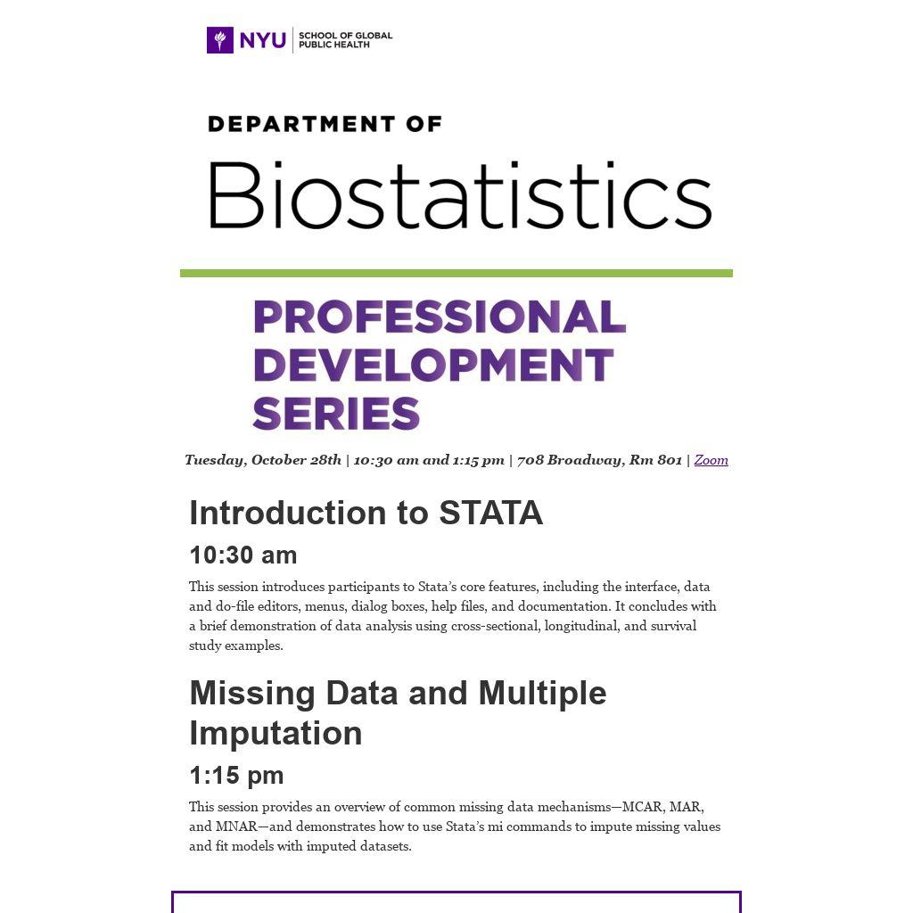 This session provides an overview of common missing data mechanisms—MCAR, MAR, and MNAR—and demonstrates how to use Stata’s mi commands to impute missing values and fit models with imputed datasets.