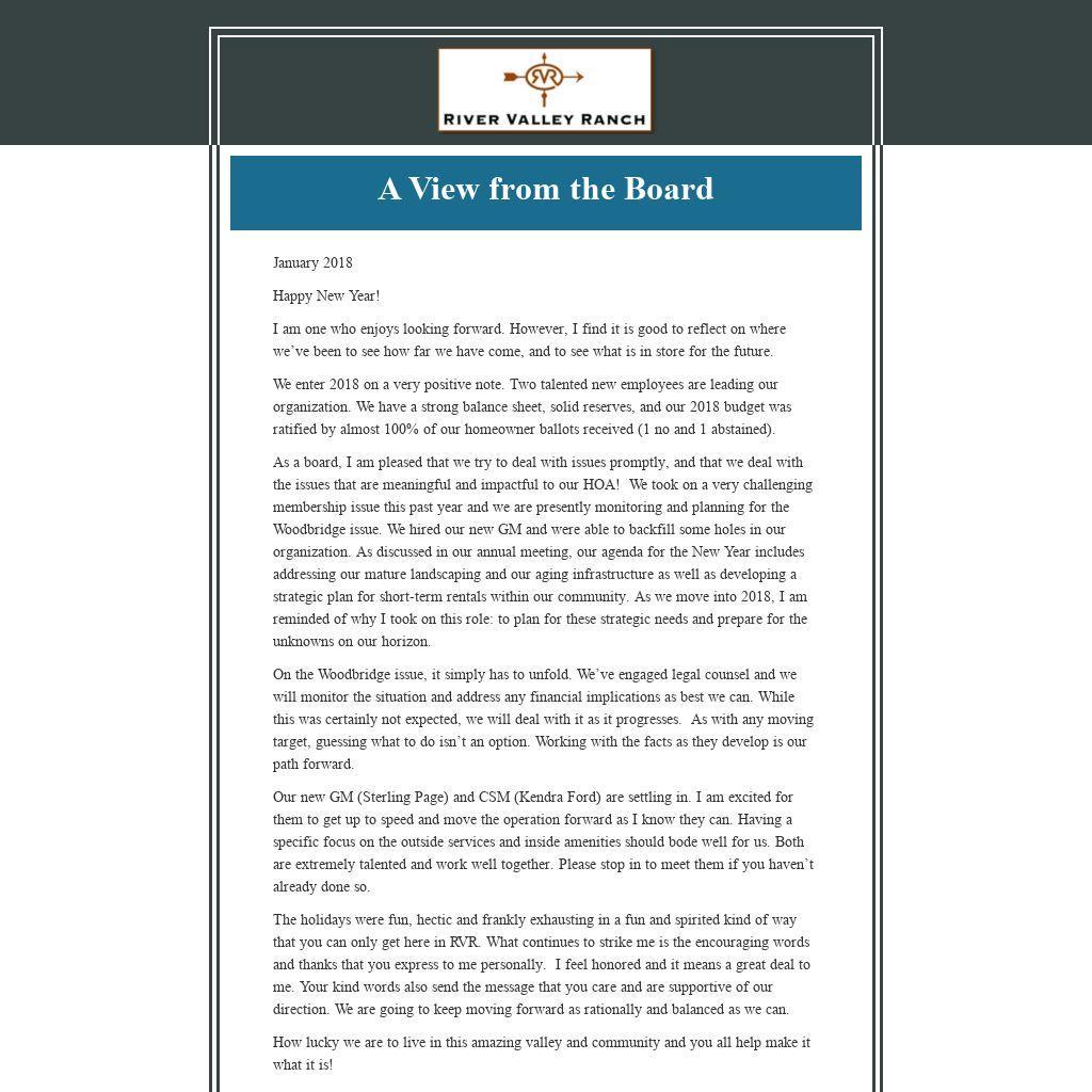 As a board, I am pleased that we try to deal with issues promptly, and that we deal with the issues that are meaningful and impactful to our HOA! We took on a very challenging membership issue this past year and we are presently monitoring and planning for the Woodbridge issue. We hired our new GM and were able to backfill some holes in our organization. As discussed in our annual meeting, our agenda for the New Year includes addressing our mature landscaping and our aging infrastructure as well as developing a strategic plan for short-term rentals within our community. As we move into 2018, I am reminded of why I took on this role: to plan for these strategic needs and prepare for the unknowns on our horizon.