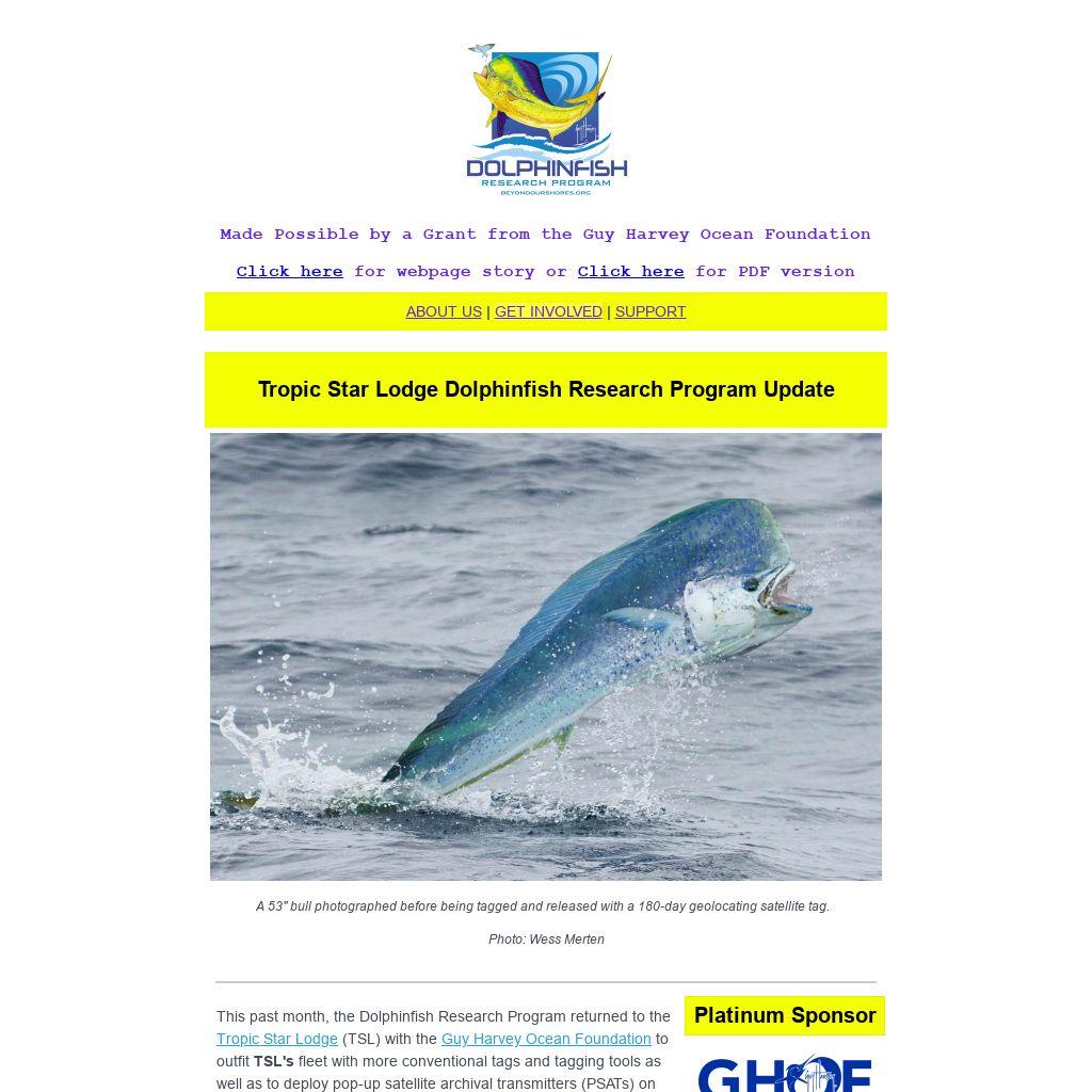 This past month, the Dolphinfish Research Program returned to the Tropic Star Lodge (TSL) with the Guy Harvey Ocean Foundation to outfit TSL's fleet with more conventional tags and tagging tools as well as to deploy pop-up satellite archival transmitters (PSATs) on large dolphinfish. After 7.5 days of non-stop fishing, including a couple days participating in TSL's 2021 Billfish Tournament, the fleet, as well as our tagging team, were able to tag and release