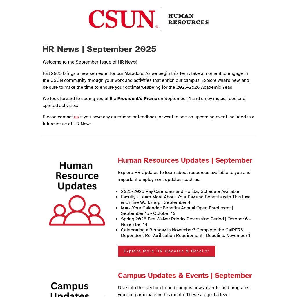 Fall 2025 brings a new semester for our Matadors. As we begin this term, take a moment to engage in the CSUN community through your work and activities that enrich our campus. Explore what's new, and be sure to make the time to ensure your optimal wellbeing for the 2025-2026 Academic Year!