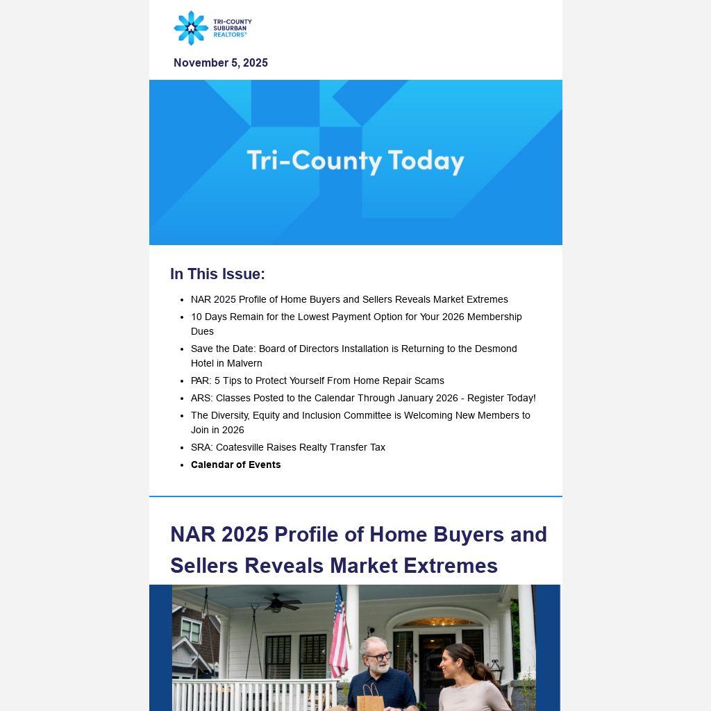 Tri-County Suburban REALTORS® members have just 10 days left to take advantage of the lowest payment amount in the 2026 dues billing cycle. Your Tri-County Suburban REALTORS® membership continues to deliver unmatched value—providing access to tools and resources like Lone Wolf Transactions ($425 value), E-Signature Software ($240 value), Municipal Information Database ($200 value), Tech Helpline ($250 value), RISMedia ($249 value), FOREWARN ($300 value), and more—all included with your dues.