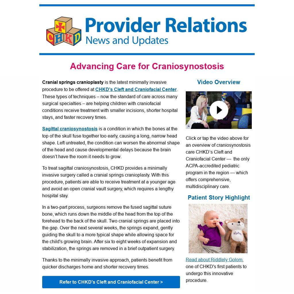 The preferred distribution method of the Provider Relations newsletter is via email. Please contact a CHKD Provider Relations Liaison to be added to our email distribution list or signup online here.