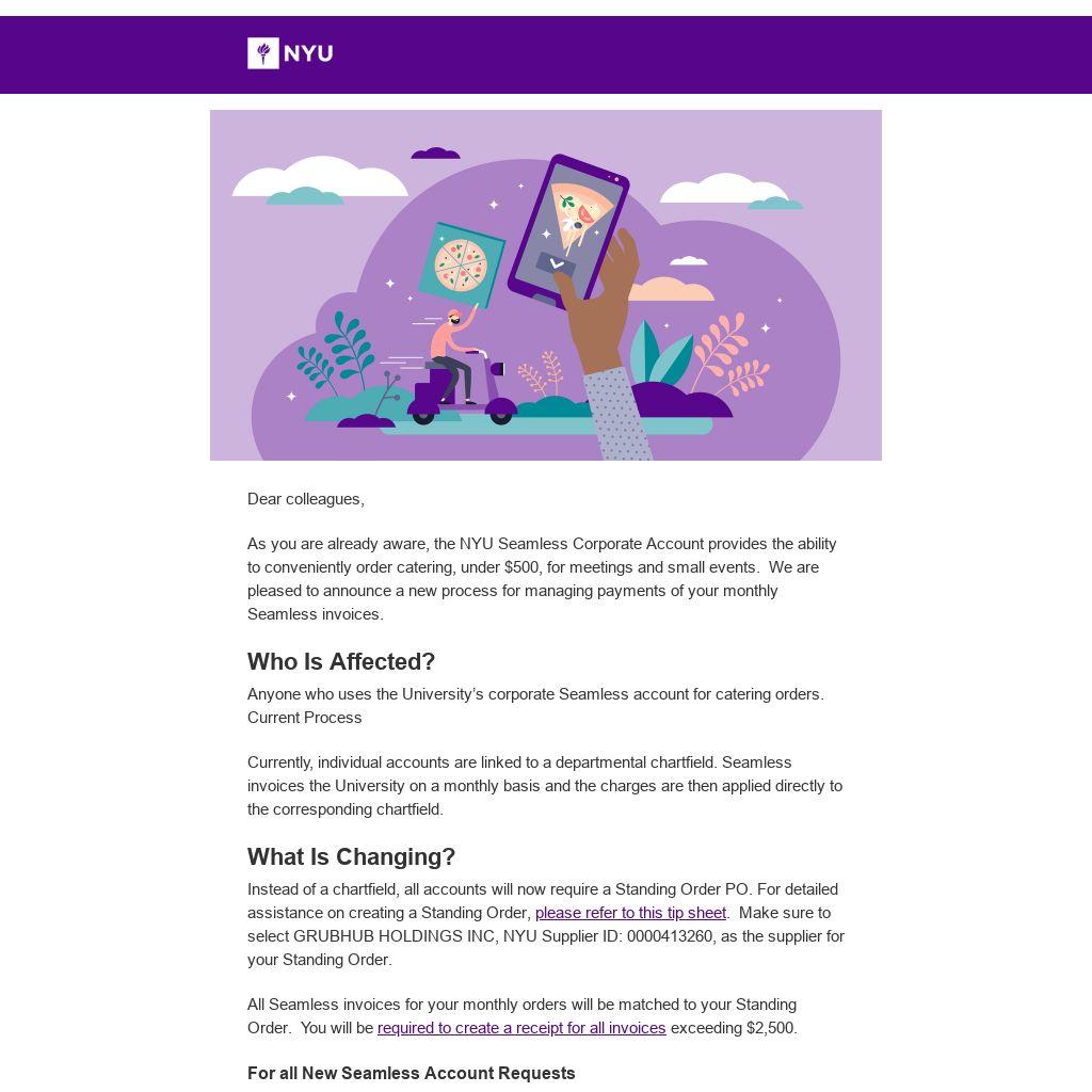As you are already aware, the NYU Seamless Corporate Account provides the ability to conveniently order catering, under $500, for meetings and small events. We are pleased to announce a new process for managing payments of your monthly Seamless invoices.