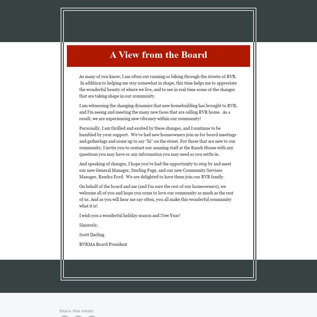 I am witnessing the changing dynamics that new homebuilding has brought to RVR, and I’m seeing and meeting the many new faces that are calling RVR home. As a result, we are experiencing new vibrancy within our community!