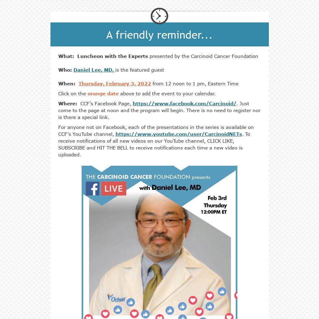Where:  CCF’s Facebook Page, https://www.facebook.com/Carcinoid/. Just come to the page at noon and the program will begin. There is no need to register nor is there a special link.