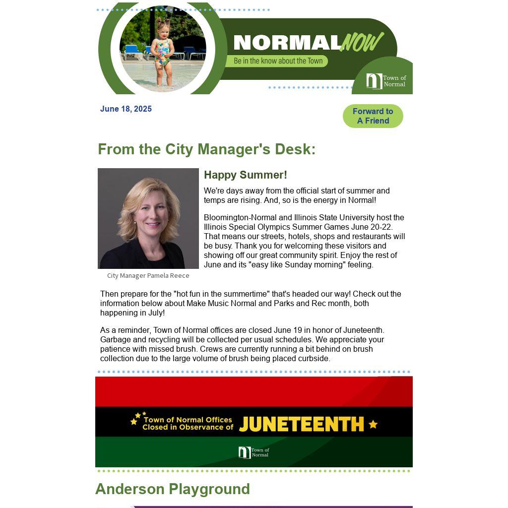 As a reminder, Town of Normal offices are closed June 19 in honor of Juneteenth. Garbage and recycling will be collected per usual schedules. We appreciate your patience with missed brush. Crews are currently running a bit behind on brush collection due to the large volume of brush being placed curbside.