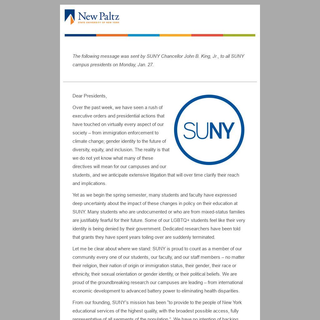 From our founding, SUNY’s mission has been “to provide to the people of New York educational services of the highest quality, with the broadest possible access, fully representative of all segments of the population.” We have no intention of backing away from that mission and its inherent commitment to a diverse and inclusive university and society.