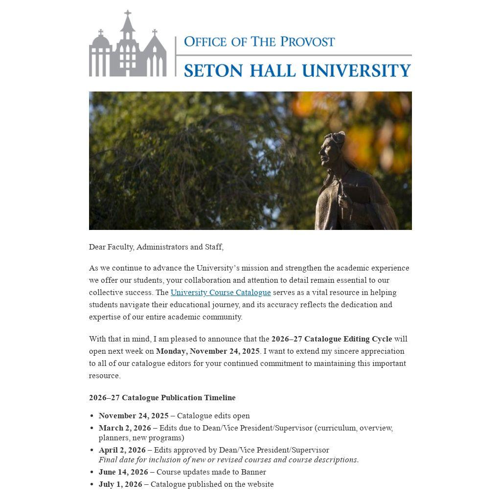 As we prepare for the upcoming publication cycle, I want to thank you for the care and professionalism you bring to this work each year. Your efforts ensure that our academic catalogue remains a reliable and comprehensive reflection of the excellence that defines Seton Hall University.
