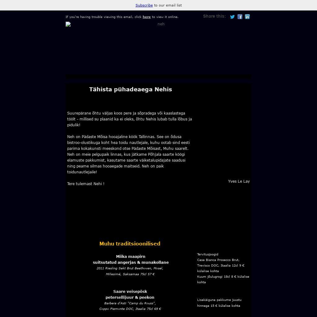 Neh on Pädaste Mõisa hooajaline köök Tallinnas. See on õdusa bistroo-olustikuga koht hea toidu nautlejale, kuhu ootab sind eesti parima kokakunsti meeskond otse Pädaste Mõisast, Muhu saarelt. Neh on meie pelgupaik linnas, kus jätkame Põhjala saarte köögi elamuste pakkumist, kasutame saarte väiketalupidajate saadusi ning peame silmas hooaegade maitseid. Neh on paik toidunautlejaile!