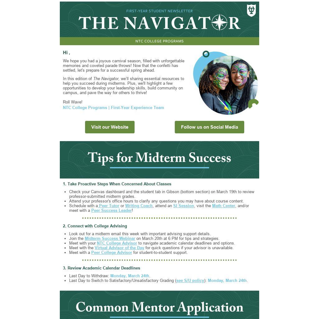 In this edition of The Navigator, we’ll sharing essential resources to help you succeed during midterms. Plus, we'll highlight a few opportunities to develop your leadership skills, build community on campus, and pave the way for others to thrive!
