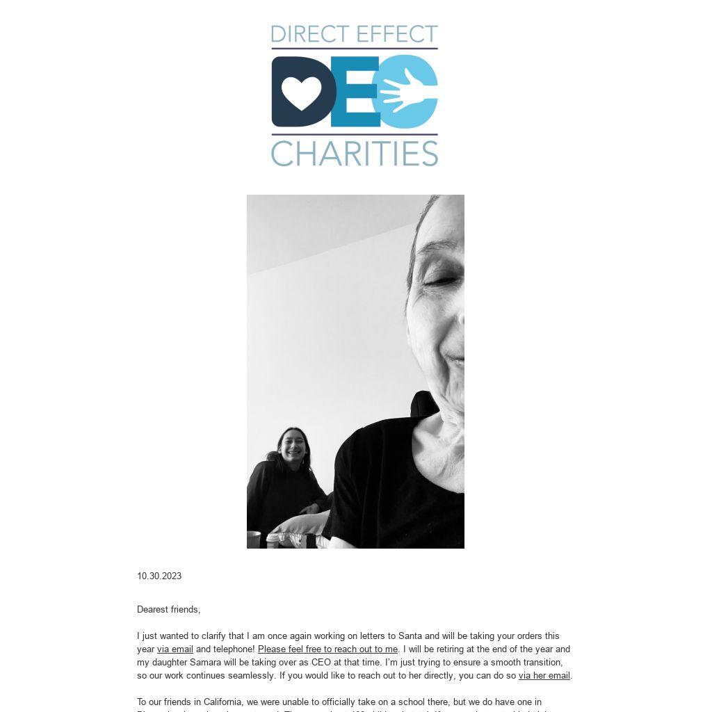 I just wanted to clarify that I am once again working on letters to Santa and will be taking your orders this year via email and telephone! Please feel free to reach out to me. I will be retiring at the end of the year and my daughter Samara will be taking over as CEO at that time. I’m just trying to ensure a smooth transition, so our work continues seamlessly. If you would like to reach out to her directly, you can do so via her email.