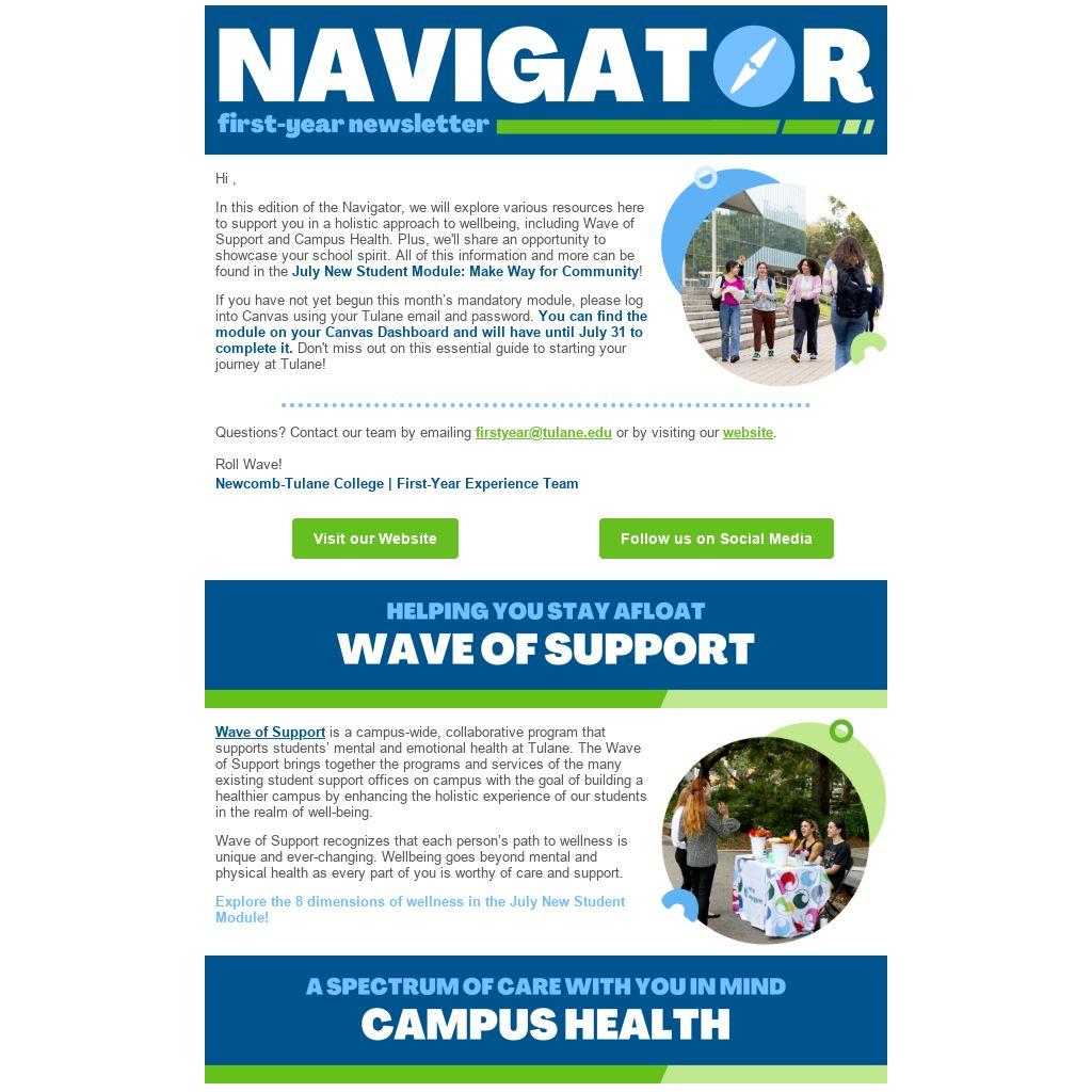 In this edition of the Navigator, we will explore various resources here to support you in a holistic approach to wellbeing, including Wave of Support and Campus Health. Plus, we'll share an opportunity to showcase your school spirit. All of this information and more can be found in the July New Student Module: Make Way for Community!
