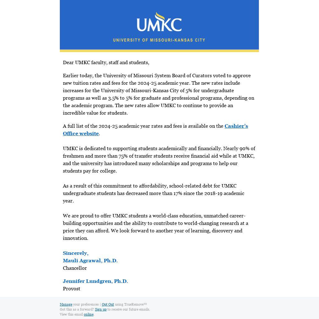 Earlier today, the University of Missouri System Board of Curators voted to approve new tuition rates and fees for the 2024-25 academic year. The new rates include increases for the University of Missouri-Kansas City of 5% for undergraduate programs as well as 3.5% to 5% for graduate and professional programs, depending on the academic program. The new rates allow UMKC to continue to provide an incredible value for students.