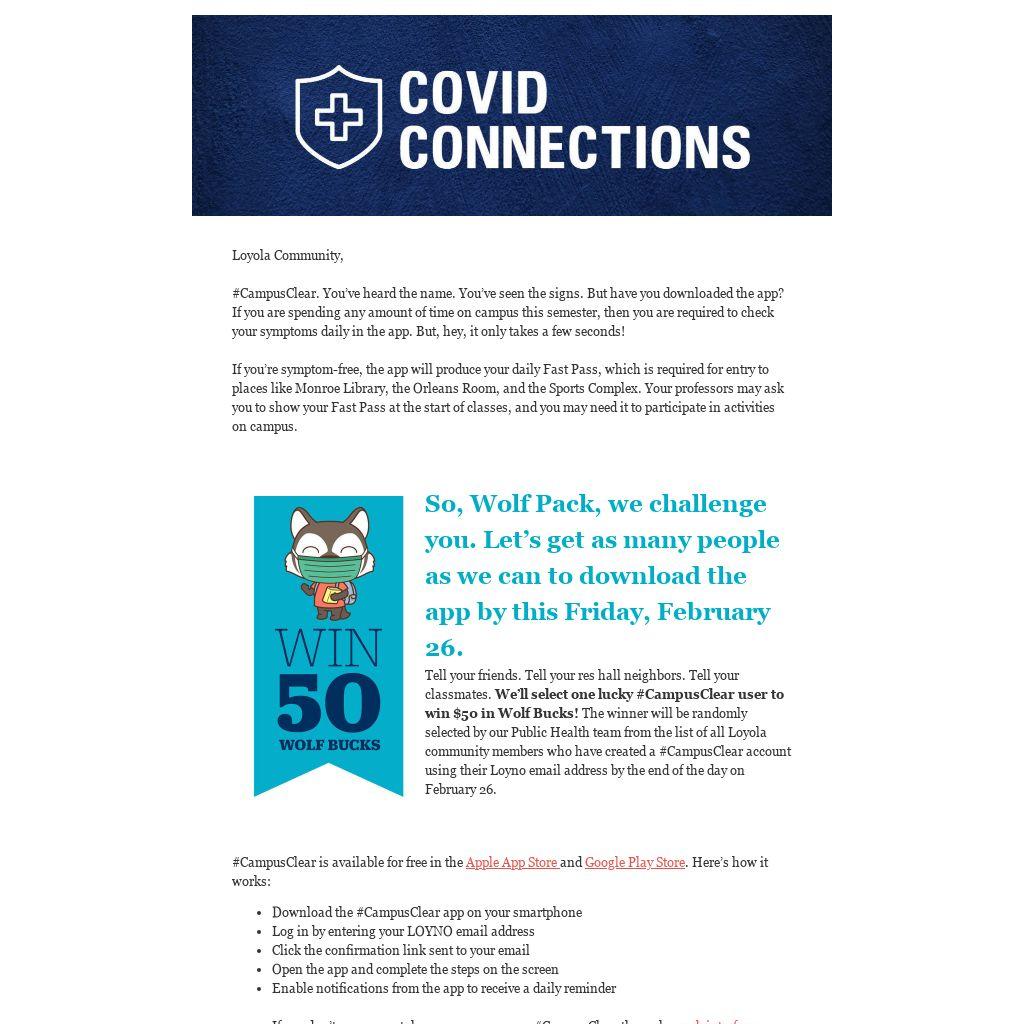#CampusClear. You’ve heard the name. You’ve seen the signs. But have you downloaded the app? If you are spending any amount of time on campus this semester, then you are required to check your symptoms daily in the app. But, hey, it only takes a few seconds!