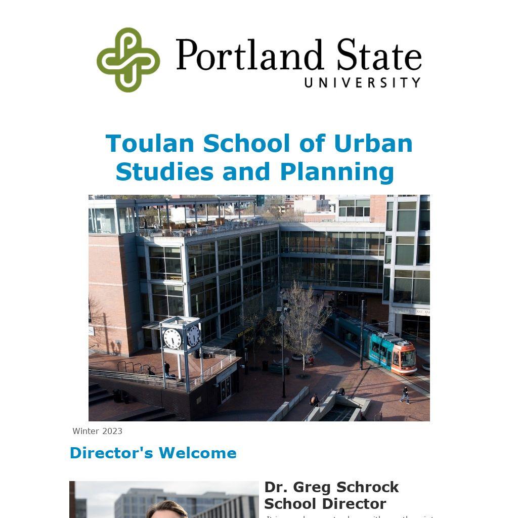It is my pleasure to share with you the winter 2023 edition of our Toulan School of Urban Studies and Planning newsletter. Our aim is to be in more regular communication with friends like you about the exciting work happening here at the Toulan School, the impact that work has on students and our communities, and ways you can get involved and support our work.