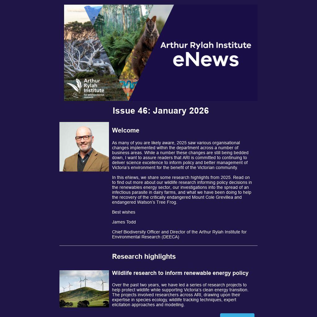 As many of you are likely aware, 2025 saw various organisational changes implemented within the department across a number of business areas. While a number these changes are still being bedded down, I want to assure readers that ARI is committed to continuing to deliver science excellence to inform policy and better management of Victoria’s environment for the benefit of the Victorian community.