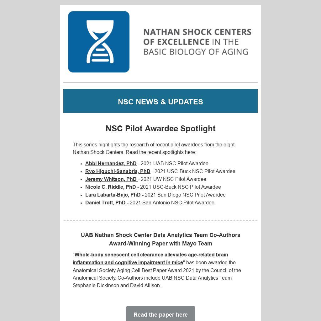 This newsletter is produced by the American Federation for Aging Research, which serves as the Coordinating Center of the Nathan Shock Centers of Excellence in the Basic Biology of Aging. The Nathan Shock Centers program is funded by the National Institutes of Health National Institute of Aging. Research reported in this publication was supported by the National Institute on Aging of the National Institutes of Health under Award Number U24AG056053. The content is solely the responsibility of the authors and does not necessarily represent the official views of the National Institutes of Health.