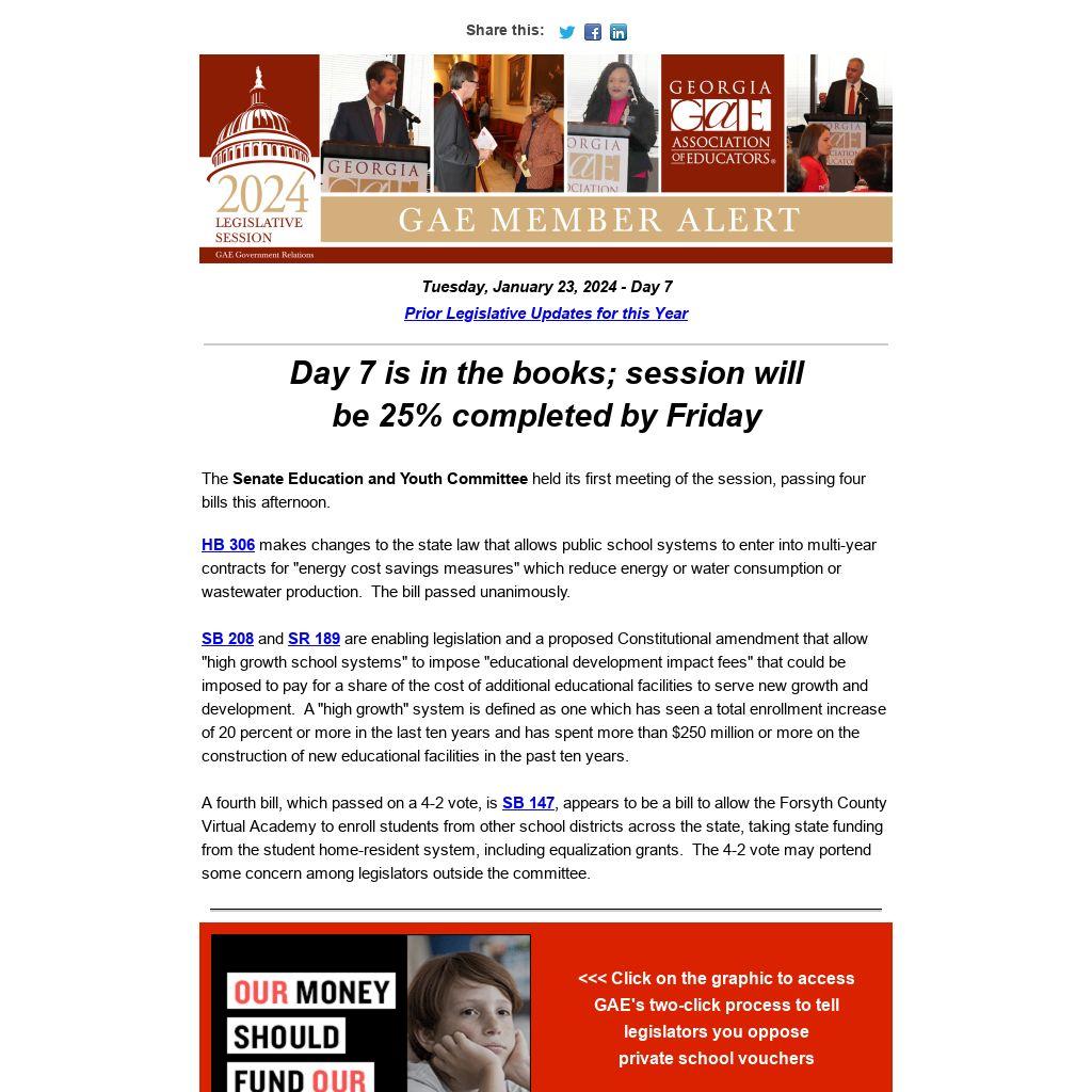 SB 105, a GAE initiative to eliminate the statutory limits on pension benefits for school bus drivers, cafeteria staff, bus drivers, and maintenance, will reportedly be considered by the Senate Retirement Committee Thursday.