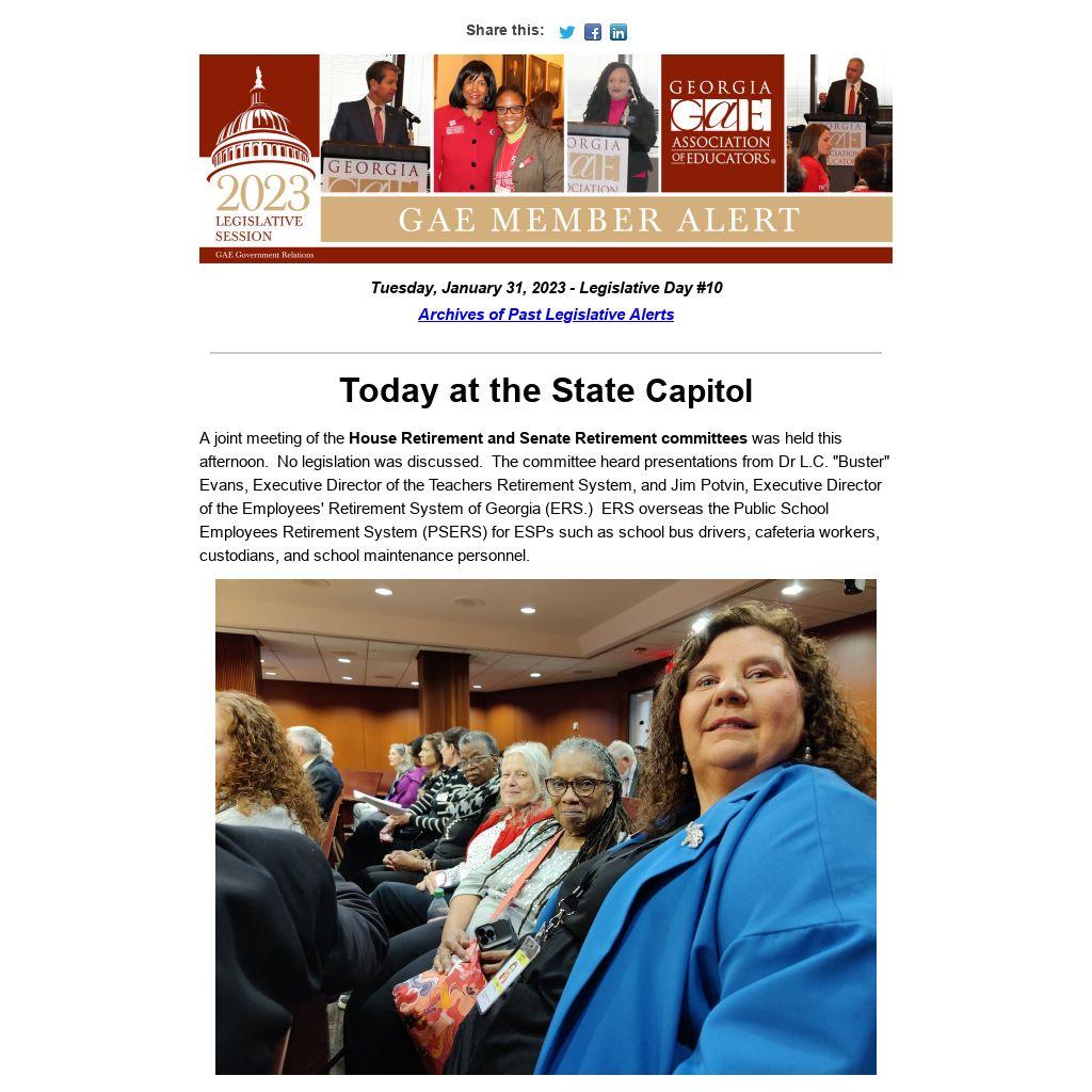 As the legislative session moves forward, you will want to follow up with your legislators on issues like TKES/LKES reform, public education funding, educator recruitment and retention, and many other issues that will come up, and GAE will provide you the information you need to do so.