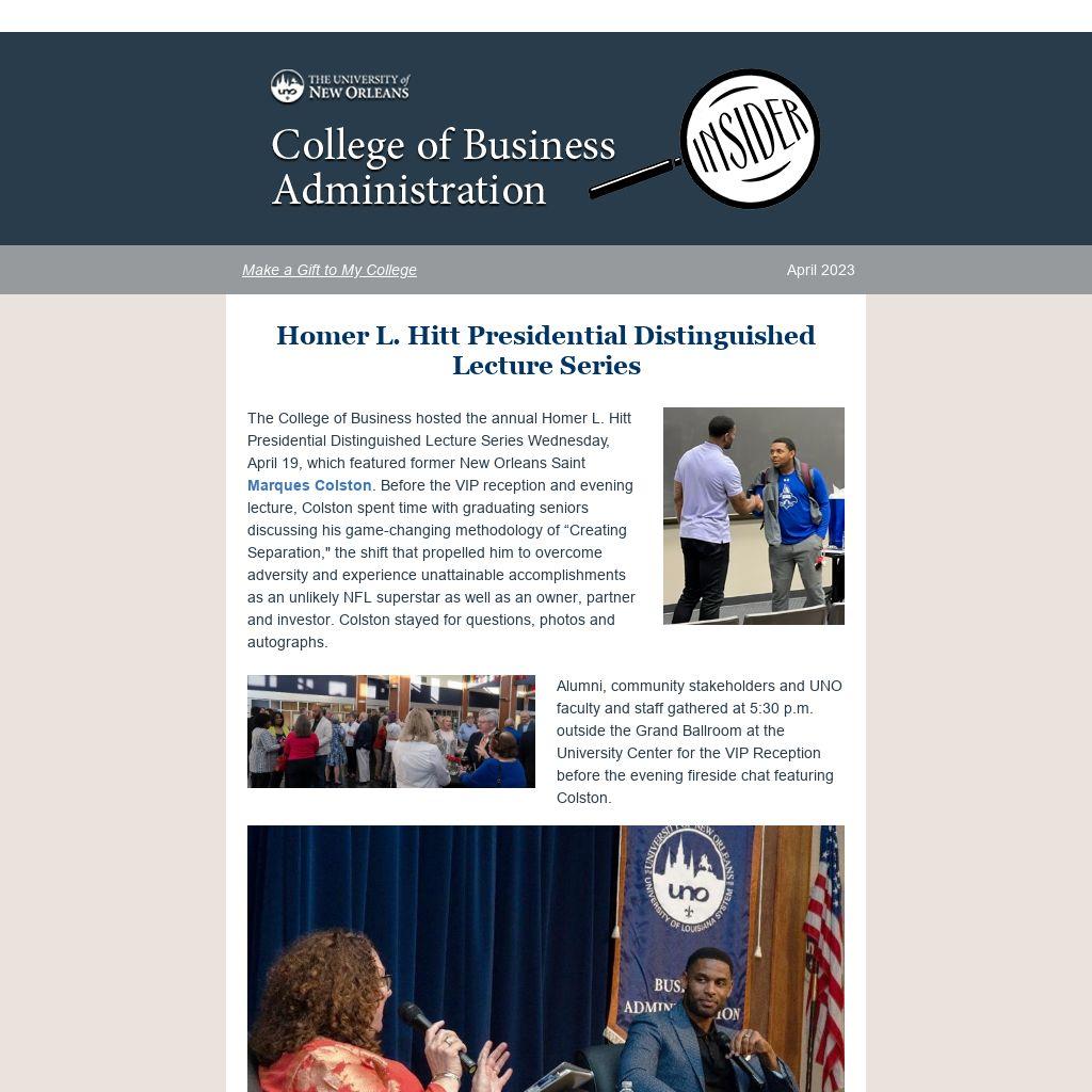 The College of Business hosted the annual Homer L. Hitt Presidential Distinguished Lecture Series Wednesday, April 19, which featured former New Orleans Saint Marques Colston. Before the VIP reception and evening lecture, Colston spent time with graduating seniors discussing his game-changing methodology of “Creating Separation," the shift that propelled him to overcome adversity and experience unattainable accomplishments as an unlikely NFL superstar as well as an owner, partner and investor. Colston stayed for questions, photos and autographs.
