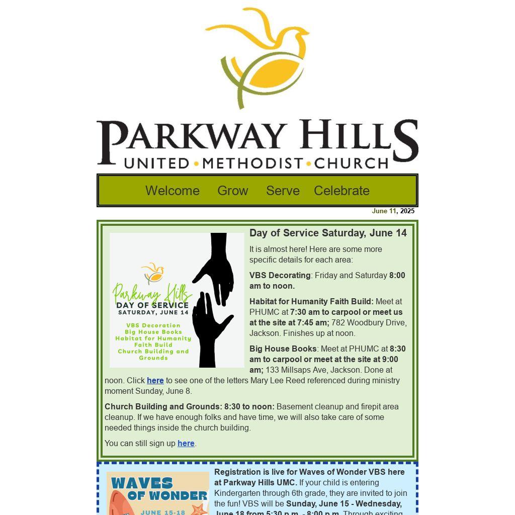 Habitat for Humanity Faith Build: Meet at PHUMC at 7:30 am to carpool or meet us at the site at 7:45 am; 782 Woodbury Drive, Jackson. Finishes up at noon.