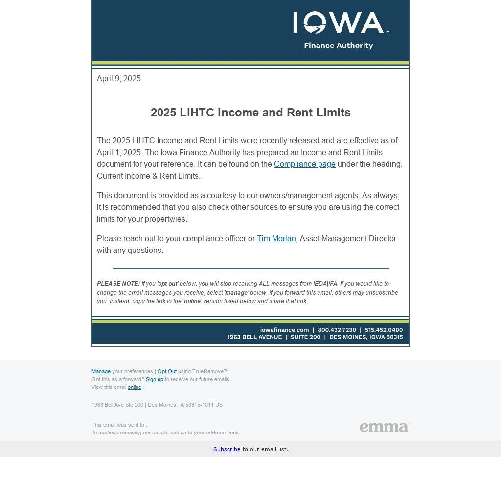 The 2025 LIHTC Income and Rent Limits were recently released and are effective as of April 1, 2025. The Iowa Finance Authority has prepared an Income and Rent Limits document for your reference. It can be found on the Compliance page under the heading, Current Income & Rent Limits.