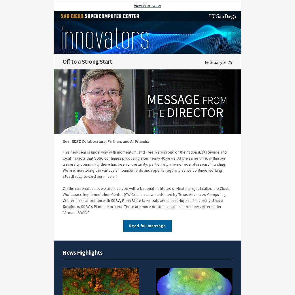 This new year is underway with momentum, and I feel very proud of the national, statewide and local impacts that SDSC continues producing after nearly 40 years. At the same time, within our university community there has been uncertainty, particularly around federal research funding. We are monitoring the various announcements and reports regularly as we continue working steadfastly toward our mission.
