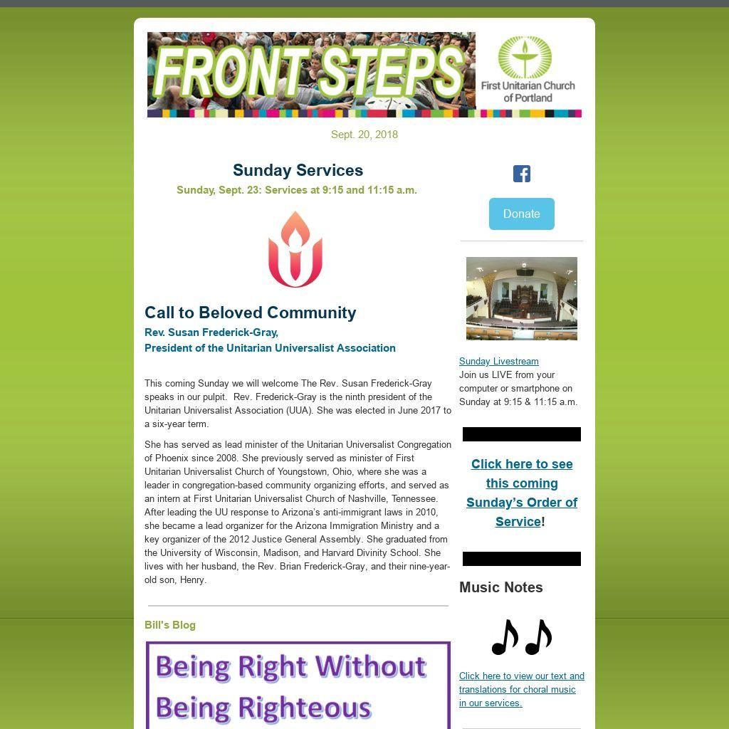 Do You Have an Item for E-news and/or the Sunday Bulletin?If you have an item you’d like published in our weekly Front Steps (eNews) or the Sunday Bulletin, please submit it to: