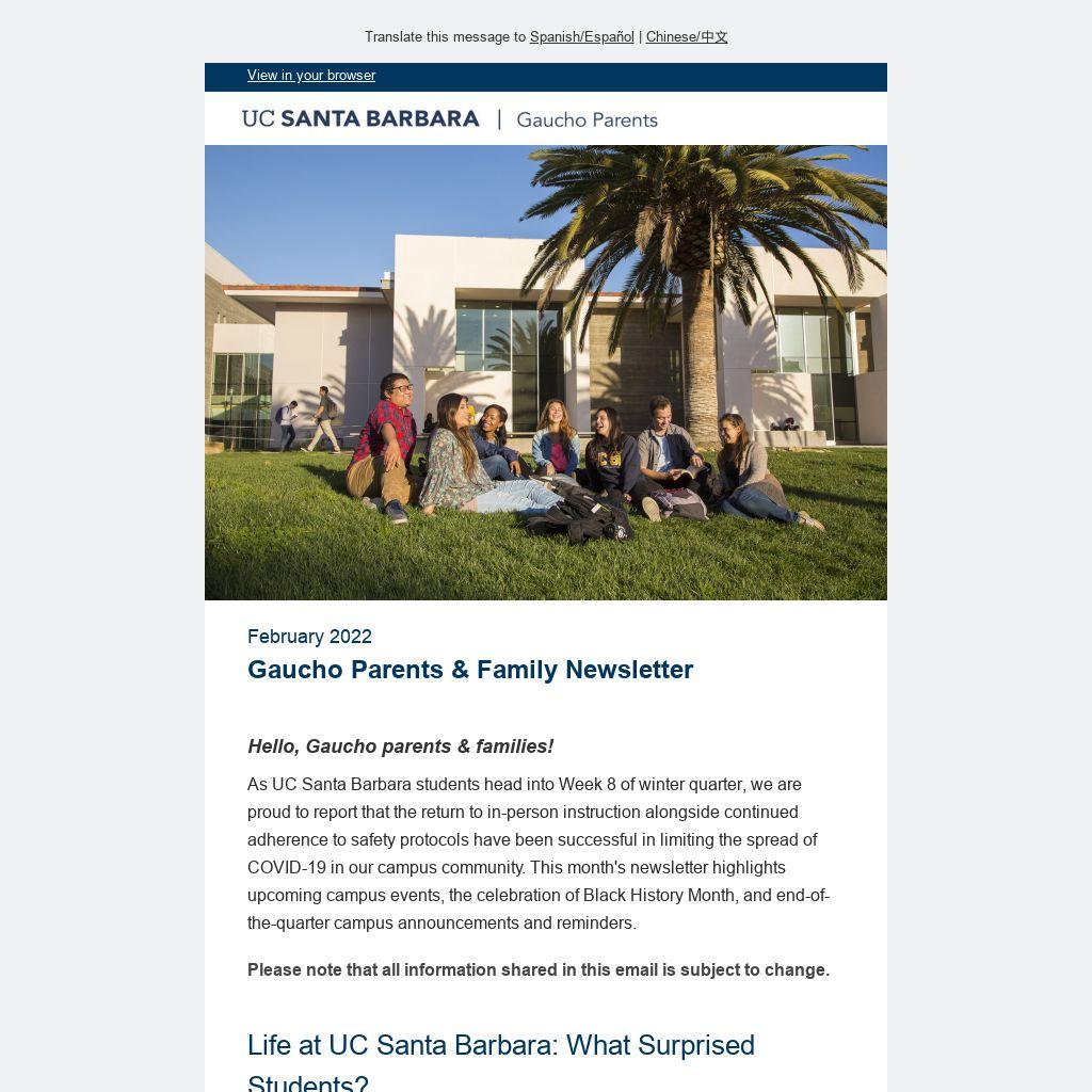 As UC Santa Barbara students head into Week 8 of winter quarter, we are proud to report that the return to in-person instruction alongside continued adherence to safety protocols have been successful in limiting the spread of COVID-19 in our campus community. This month's newsletter highlights upcoming campus events, the celebration of Black History Month, and end-of-the-quarter campus announcements and reminders.