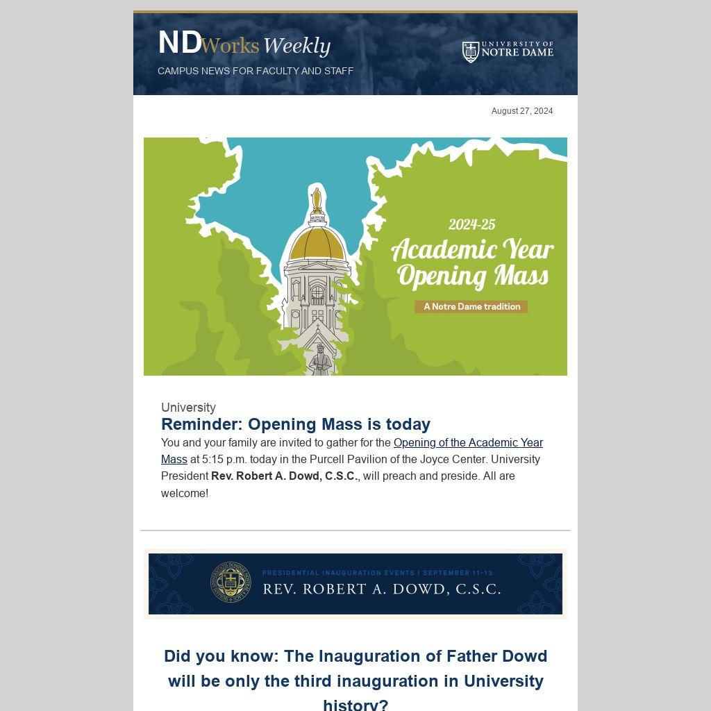 You and your family are invited to gather for the Opening of the Academic Year Mass at 5:15 p.m. today in the Purcell Pavilion of the Joyce Center. University President Rev. Robert A. Dowd, C.S.C., will preach and preside. All are welcome!