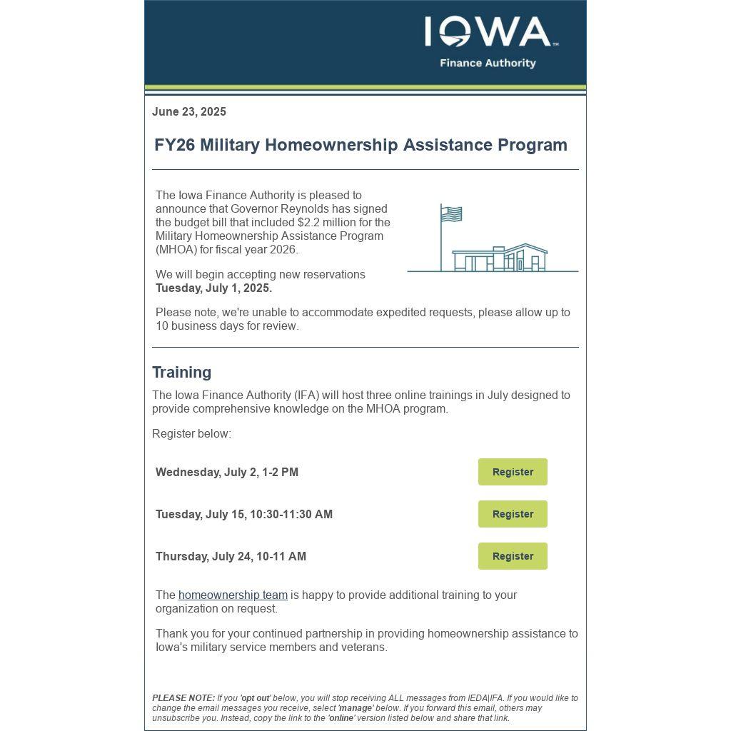 The Iowa Finance Authority is pleased to announce that Governor Reynolds has signed the budget bill that included $2.2 million for the Military Homeownership Assistance Program (MHOA) for fiscal year 2026.