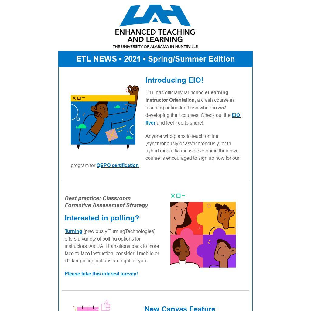 Check out the technologies UAH provides and links to resources and workshops on the UAH ETL's faculty support pages.