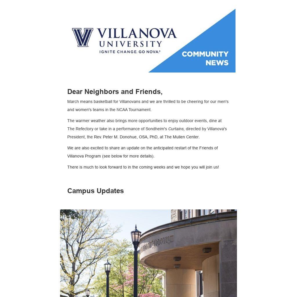 Dear Neighbors and Friends,March means basketball for Villanovans and we are thrilled to be cheering for our men's and women's teams in the NCAA Tournament.
