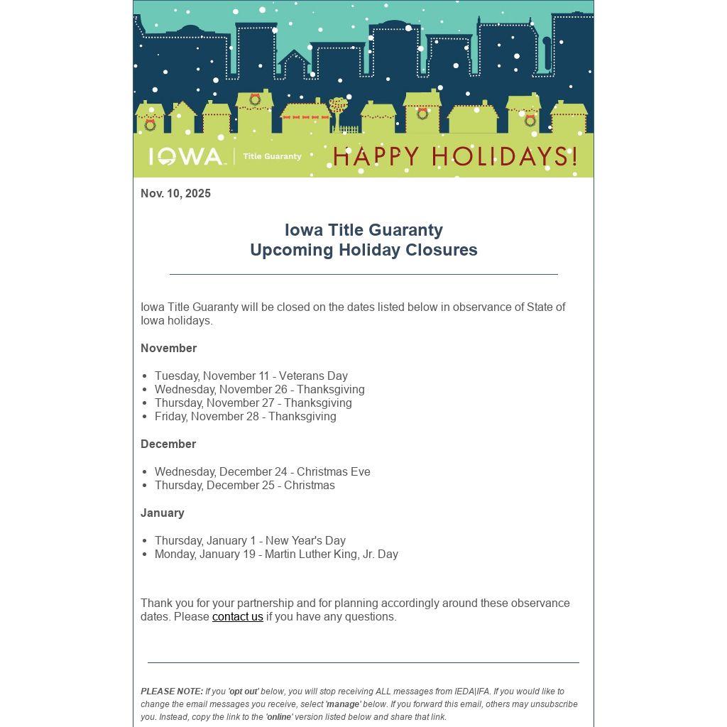 Iowa Title Guaranty will be closed on the dates listed below in observance of State of Iowa holidays.