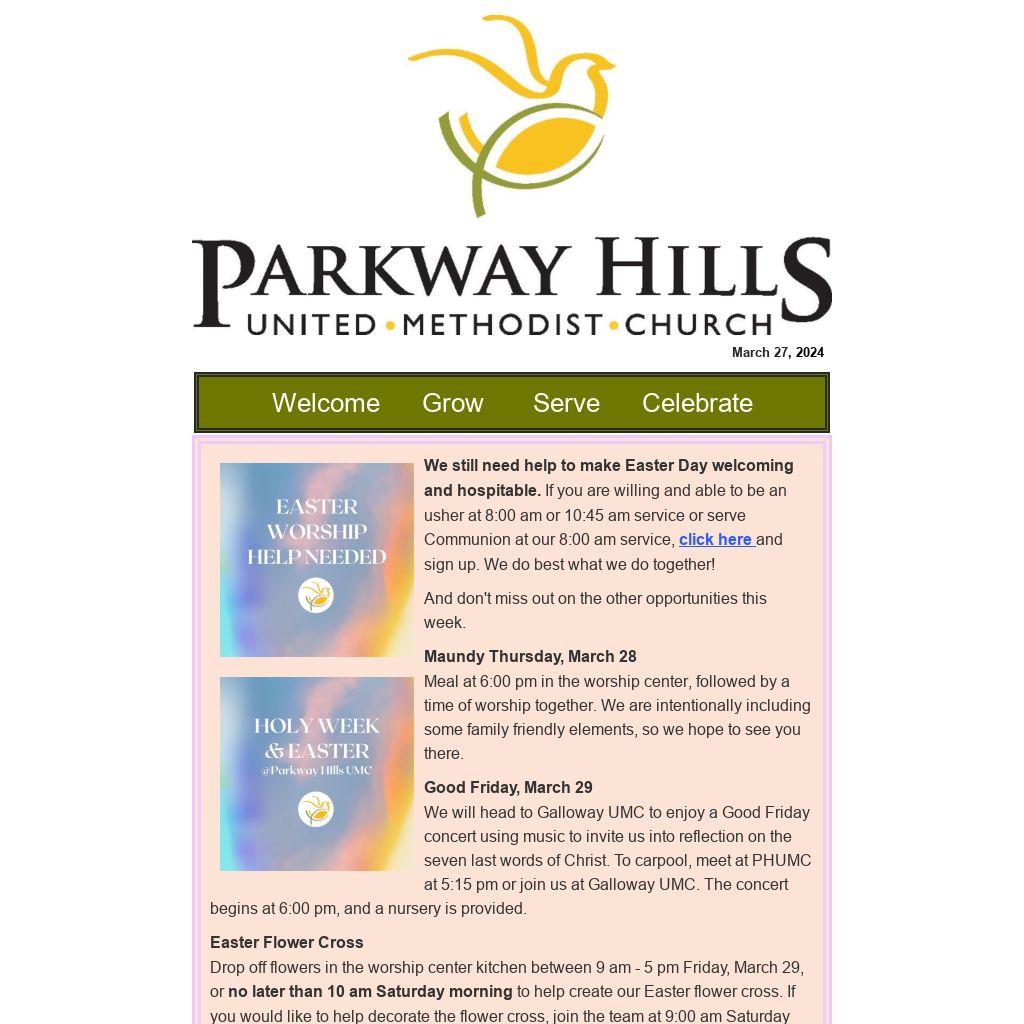 We will head to Galloway UMC to enjoy a Good Friday concert using music to invite us into reflection on the seven last words of Christ. To carpool, meet at PHUMC at 5:15 pm or join us at Galloway UMC. The concert begins at 6:00 pm, and a nursery is provided.