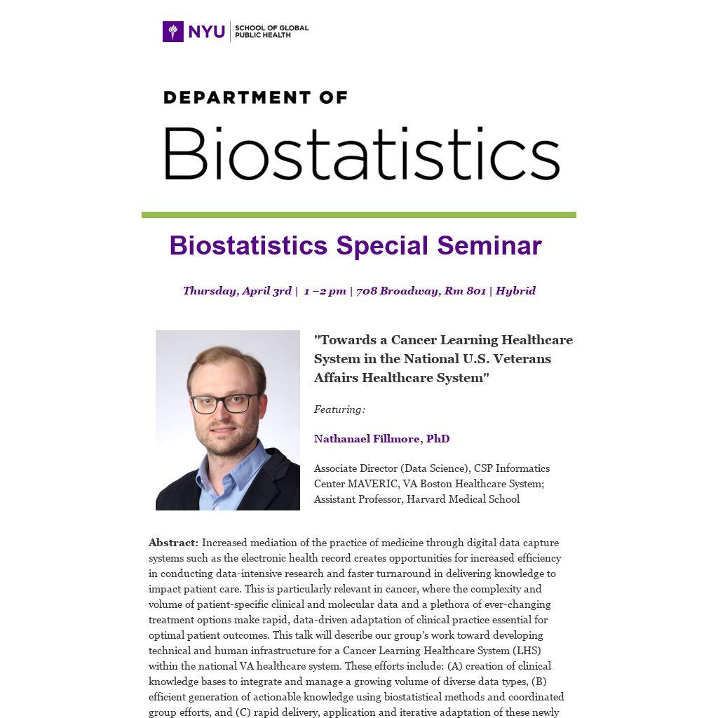 About the speaker: Nathanael (Nate) Fillmore, PhD, is the Associate Director of Data Science at the CSP Informatics Center, MAVERIC, VA Boston Healthcare System, and an Assistant Professor at Harvard Medical School. He leads a group that utilizes clinical, genomic, and imaging data, along with machine learning and statistical methods, to advance research aimed at improving patient care. His work also includes software and methodological advancements to support these efforts. His research has been published in JCO, JAMA Oncology, Blood, PNAS, Nature Medicine, and other high-impact journals.
