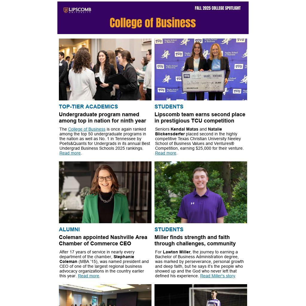 November: COB Chapel, Center for Entrepreneurship & Innovation Speaker and Lunch Series, Career Connection will hold a Business Boost, Job Search Workshop, a Resume Workshop and Etiquette Lunch, and the Clevenger Pitch Competition.