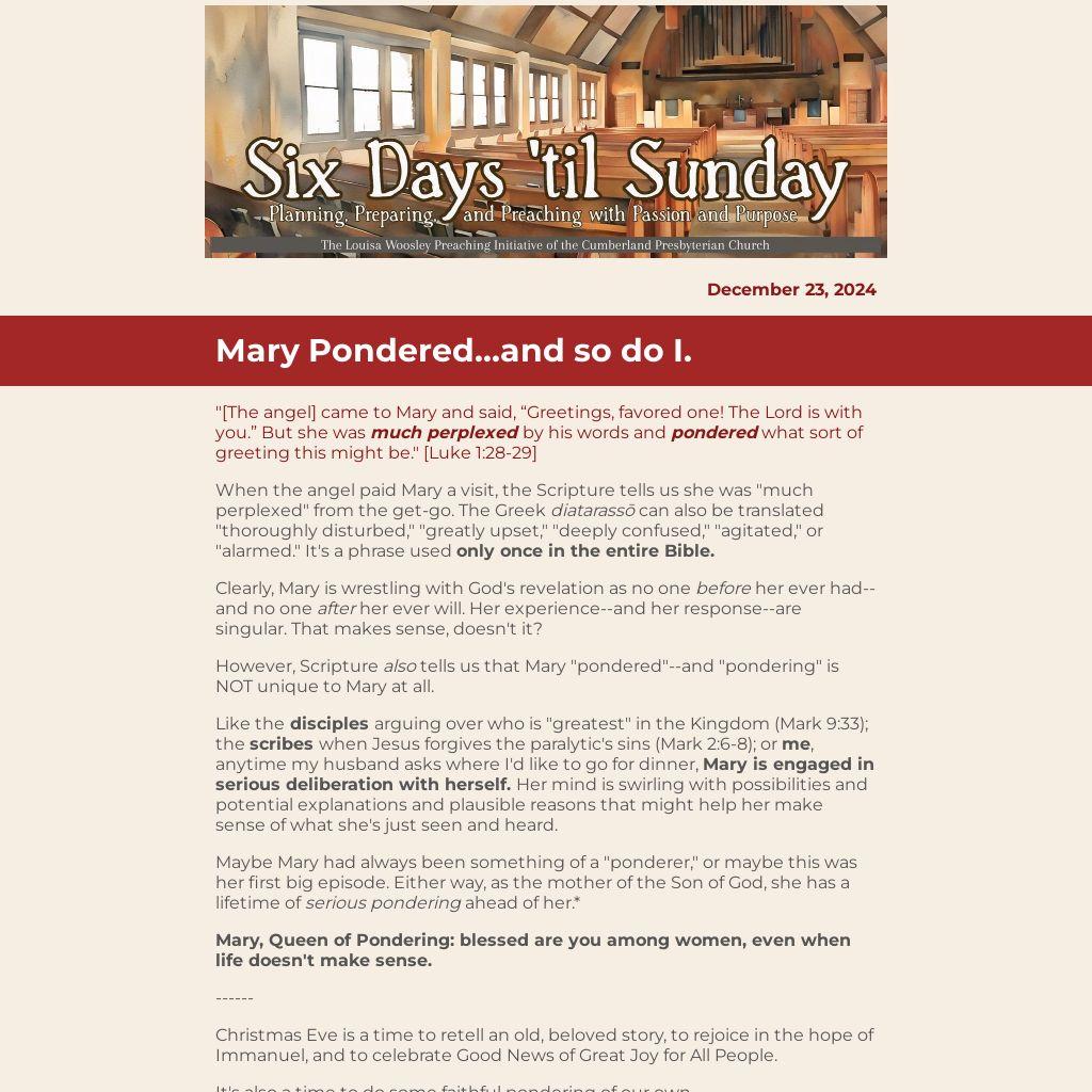 Maybe Mary had always been something of a "ponderer," or maybe this was her first big episode. Either way, as the mother of the Son of God, she has a lifetime of serious pondering ahead of her.*