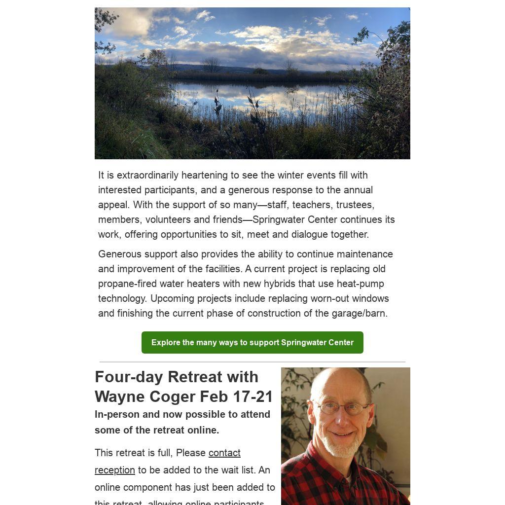 It is extraordinarily heartening to see the winter events fill with interested participants, and a generous response to the annual appeal. With the support of so manystaff, teachers, trustees, members, volunteers and friendsSpringwater Center continues its work, offering opportunities to sit, meet and dialogue together.