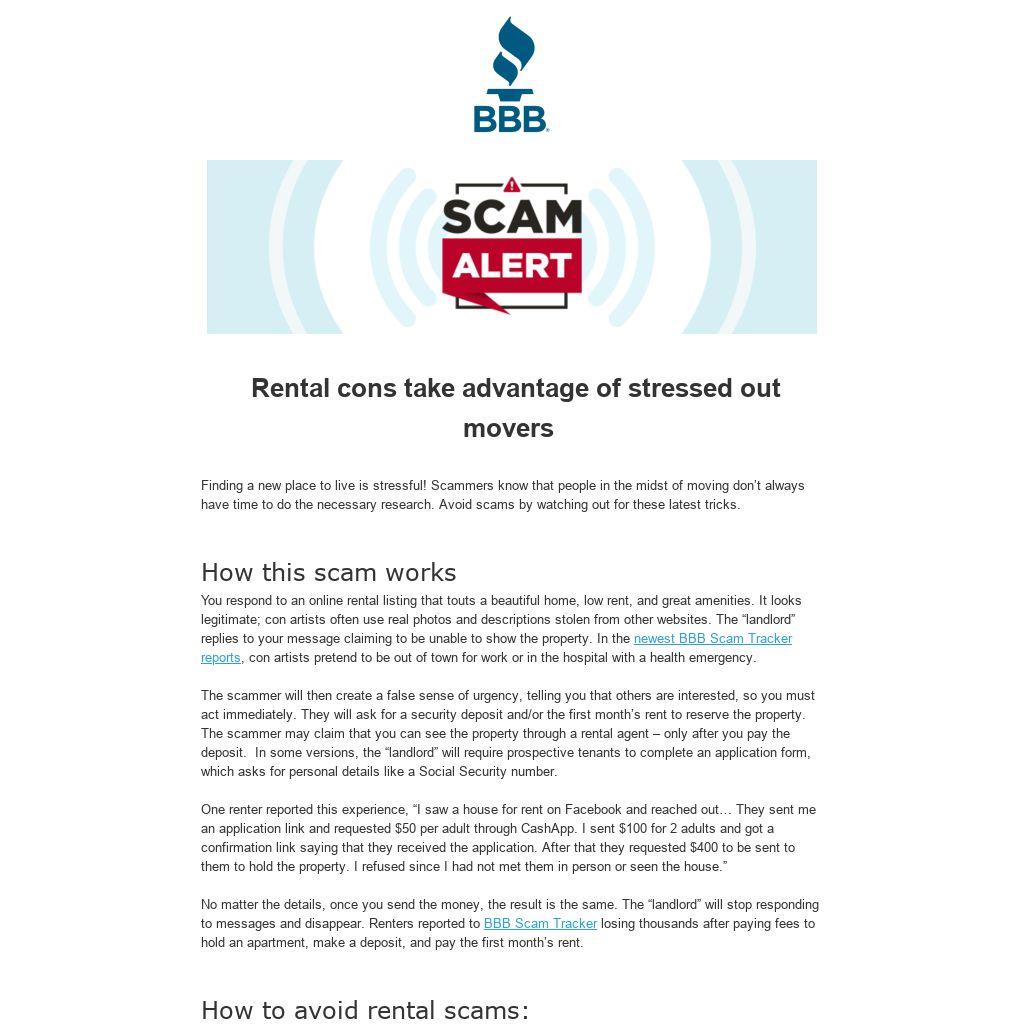 You respond to an online rental listing that touts a beautiful home, low rent, and great amenities. It looks legitimate; con artists often use real photos and descriptions stolen from other websites. The “landlord” replies to your message claiming to be unable to show the property. In thenewest BBB Scam Tracker reports, con artists pretend to be out of town for work or in the hospital with a health emergency.