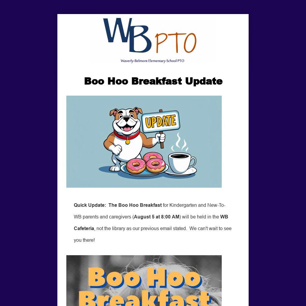 Quick Update:  The Boo Hoo Breakfast for Kindergarten and New-To-WB parents and caregivers (August 5 at 8:00 AM) will be held in the WB Cafeteria, not the library as our previous email stated.  We can't wait to see you there!