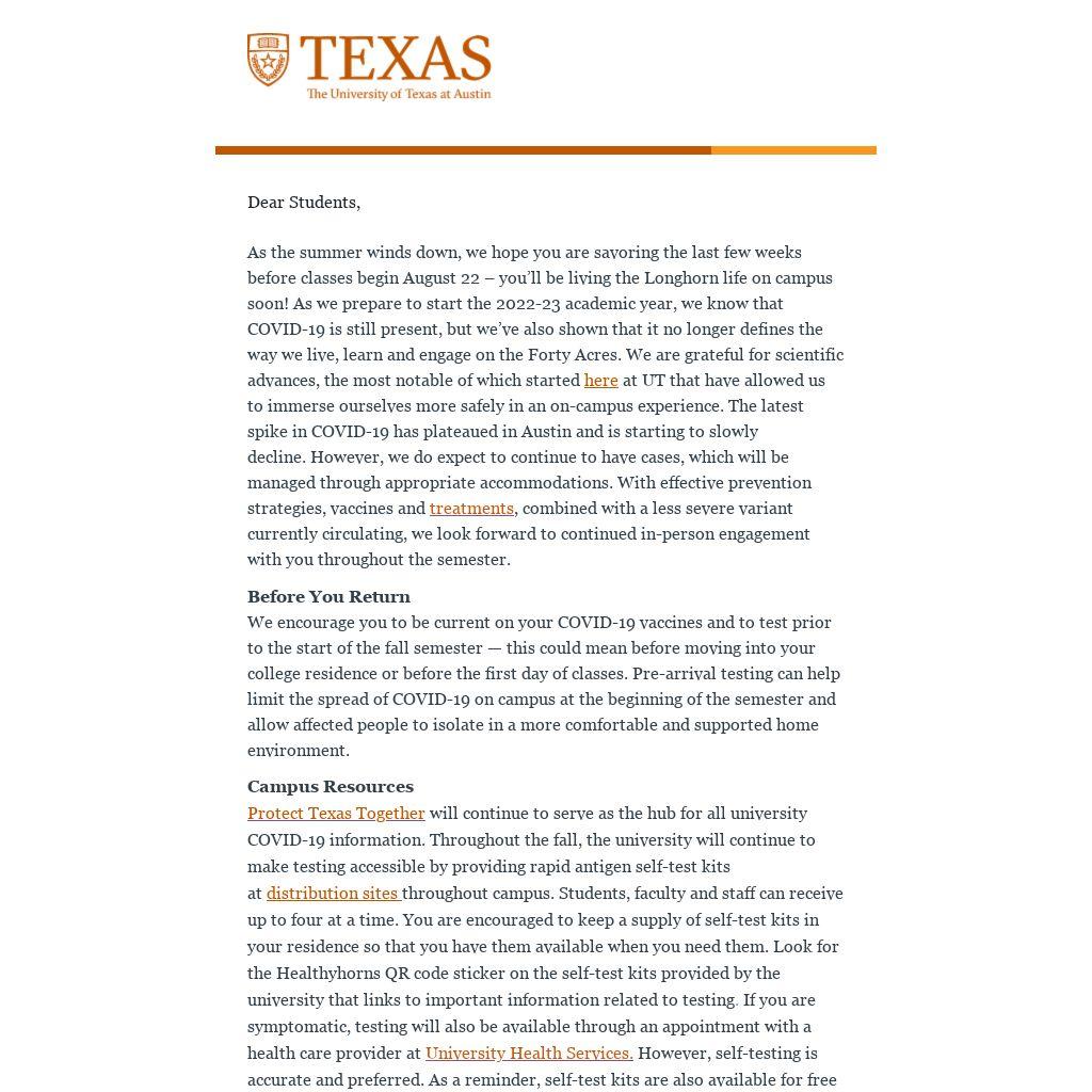 As the summer winds down, we hope you are savoring the last few weeks before classes begin August 22 – you’ll be living the Longhorn life on campus soon! As we prepare to start the 2022-23 academic year, we know that COVID-19 is still present, but we’ve also shown that it no longer defines the way we live, learn and engage on the Forty Acres. We are grateful for scientific advances, the most notable of which started here at UT that have allowed us to immerse ourselves more safely in an on-campus experience. The latest spike in COVID-19 has plateaued in Austin and is starting to slowly decline. However, we do expect to continue to have cases, which will be managed through appropriate accommodations. With effective prevention strategies, vaccines and treatments, combined with a less severe variant currently circulating, we look forward to continued in-person engagement with you throughout the semester.