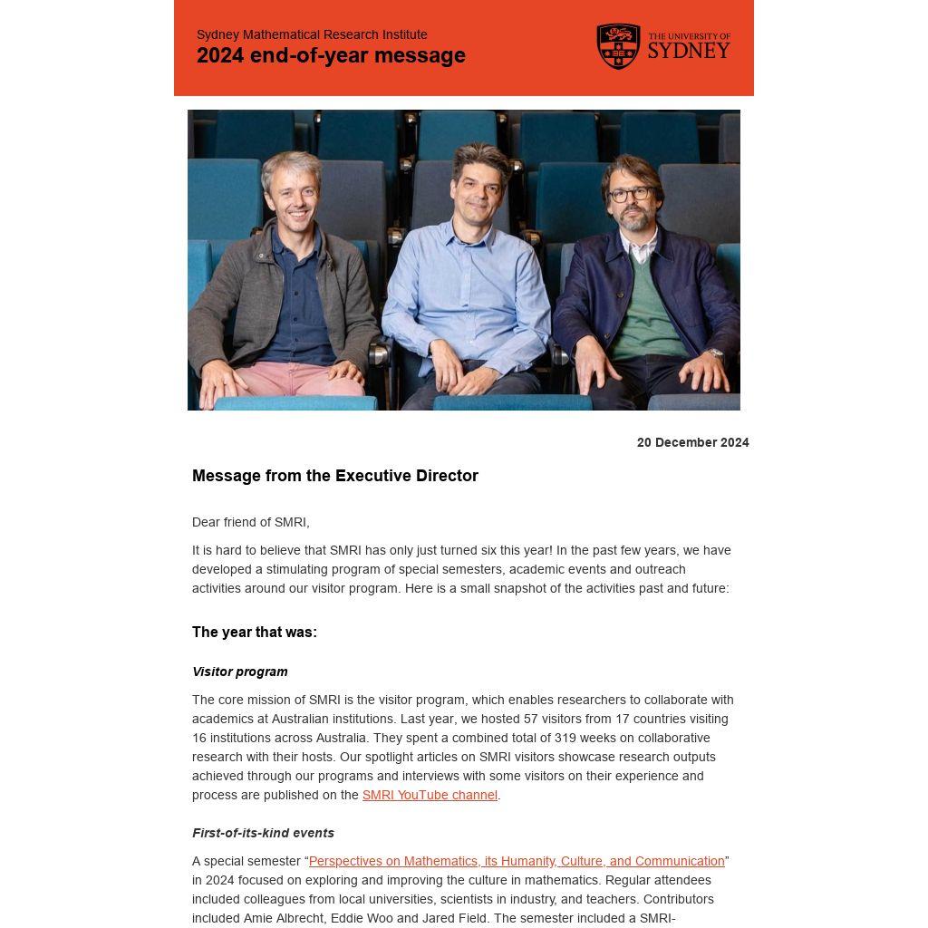 A special semester “ Perspectives on Mathematics, its Humanity, Culture, and Communication” in 2024 focused on exploring and improving the culture in mathematics. Regular attendees included colleagues from local universities, scientists in industry, and teachers. Contributors included Amie Albrecht, Eddie Woo and Jared Field. The semester included a SMRI-sponsored Australian tour by Po-Shen Loh which included workshops for high school students and in-depth examinations of teaching and communication practice.