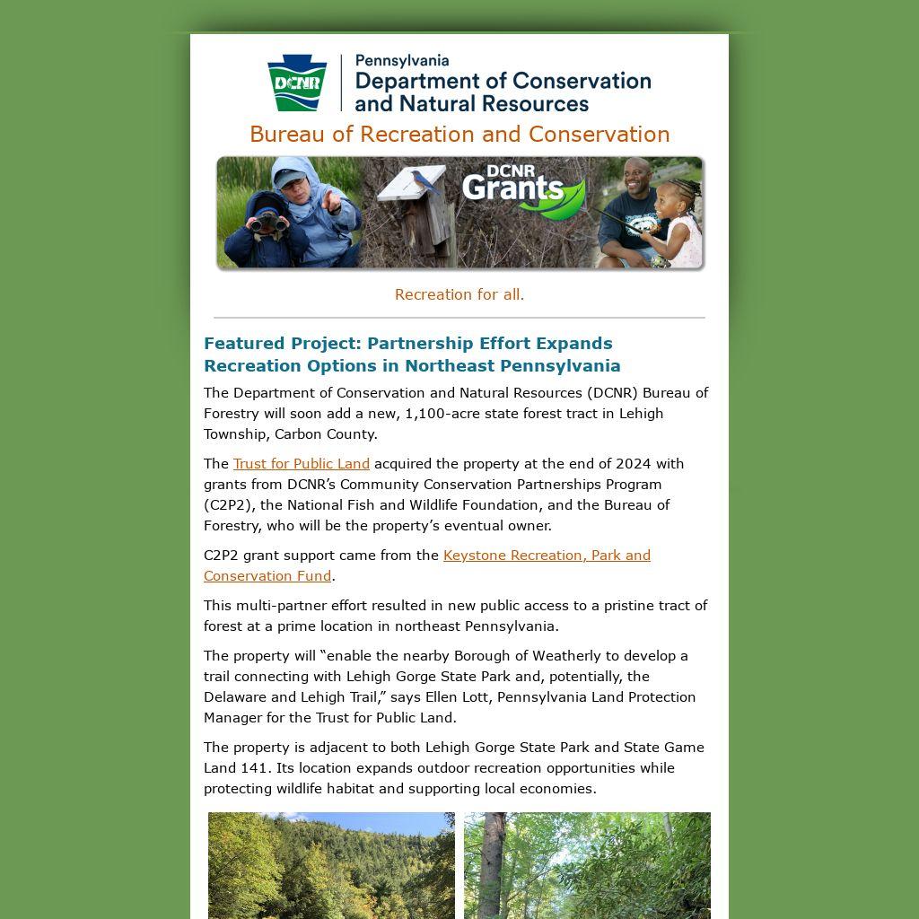 The Trust for Public Land acquired the property at the end of 2024 with grants from DCNR’s Community Conservation Partnerships Program (C2P2), the National Fish and Wildlife Foundation, and the Bureau of Forestry, who will be the property’s eventual owner.