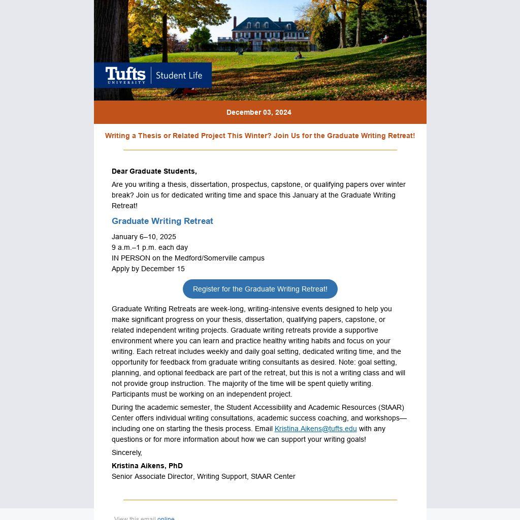 During the academic semester, the Student Accessibility and Academic Resources (StAAR) Center offers individual writing consultations, academic success coaching, and workshops—including one on starting the thesis process. Email Kristina.Aikens@tufts.edu with any questions or for more information about how we can support your writing goals!