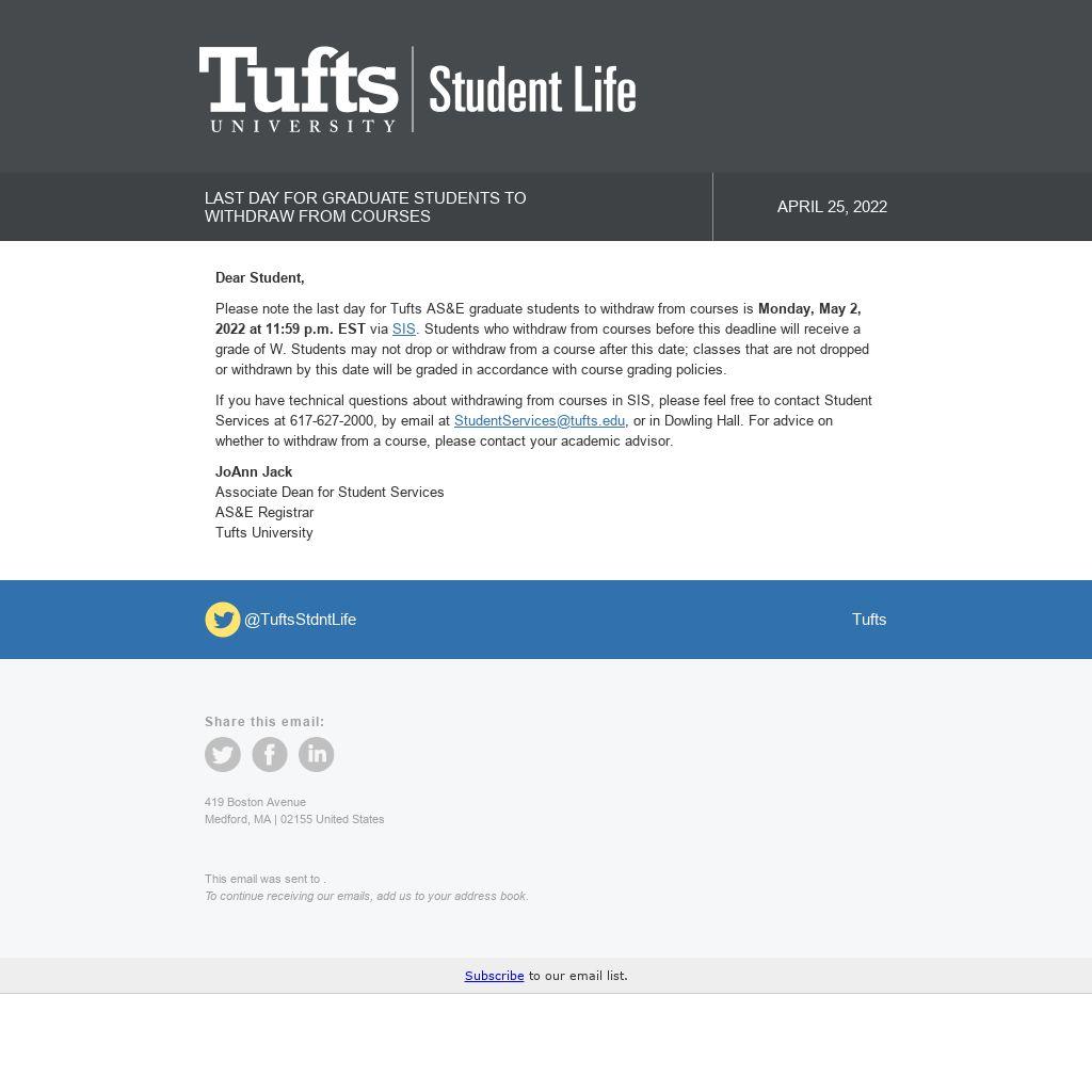 Please note the last day for Tufts AS&E graduate students to withdraw from courses is Monday, May 2, 2022 at 11:59 p.m. EST via SIS. Students who withdraw from courses before this deadline will receive a grade of W. Students may not drop or withdraw from a course after this date; classes that are not dropped or withdrawn by this date will be graded in accordance with course grading policies.