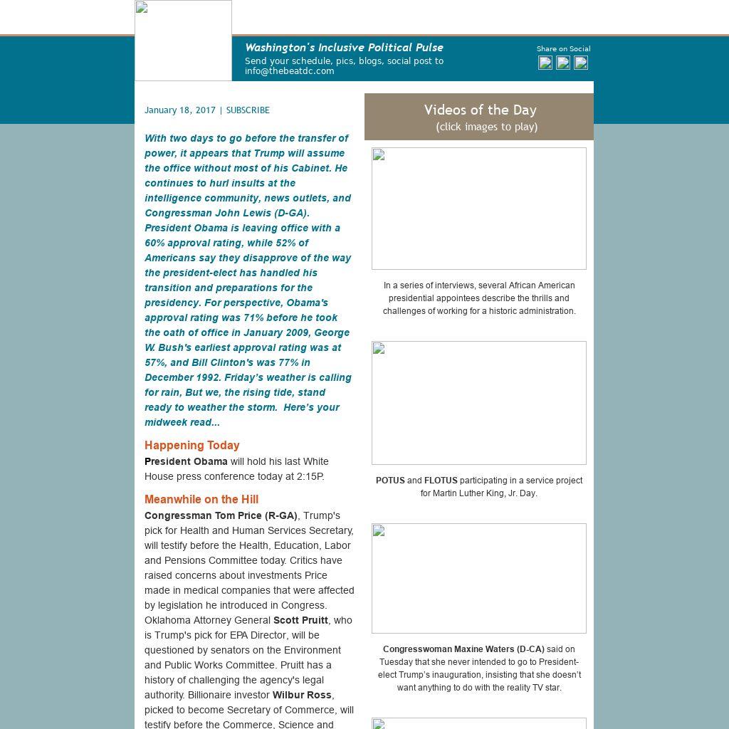 With two days to go before the transfer of power, it appears that Trump will assume the office without most of his Cabinet. He continues to hurl insults at the intelligence community, news outlets, and Congressman John Lewis (D-GA). President Obama is leaving office with a 60% approval rating, while 52% of Americans say they disapprove of the way the president-elect has handled his transition and preparations for the presidency. For perspective, Obama's approval rating was 71% before he took the oath of office in January 2009, George W. Bush's earliest approval rating was at 57%, and Bill Clinton's was 77% in December 1992. Friday’s weather is calling for rain, But we, the rising tide, stand ready to weather the storm. Here’s your midweek read...
