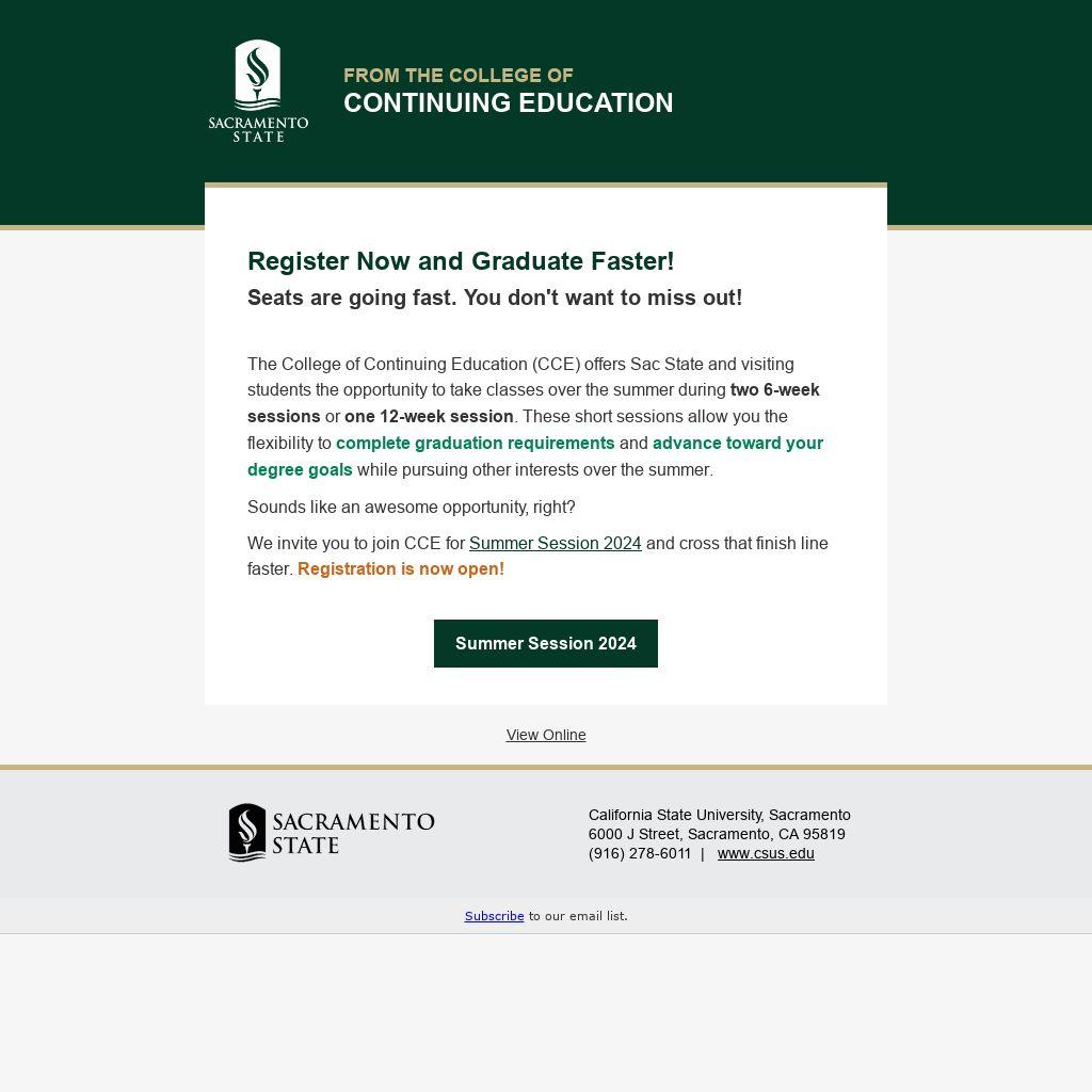The College of Continuing Education (CCE) offers Sac State and visiting students the opportunity to take classes over the summer during two 6-week sessions or one 12-week session. These short sessions allow you the flexibility to complete graduation requirements and advance toward your degree goals while pursuing other interests over the summer.